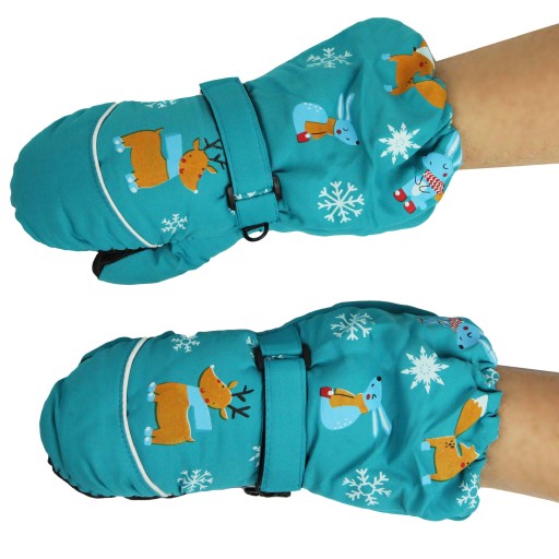 Piękne, ciepłe, jednopalczaste rękawiczki dziecięce w kolorze turkusowym, z motywem reniferka, króliczka oraz liska. Od wewnątrz wypełnione poliestrową ociepliną. Od spodu rękawiczek warstwa gumowa ułatwiająca chwytanie. Posiadają gumkę, dzięki której można je swobodnie zaciągnąć na odzież wierzchnią. Rękawiczki można spiąć razem.