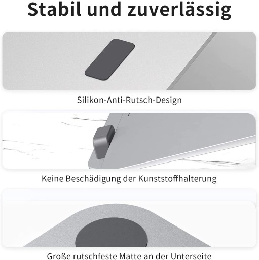 Uchwyt na laptopa wykonany jest z wysokiej jakości stopu aluminium i posiada 36 otworów wentylacyjnych. Stop aluminium ma doskonałą przewodność cieplną, oba przyczyniają się do lepszego rozpraszania ciepła. Antypoślizgowa gumowa mata na górze i ramka krawędziowa zapewniają stabilność laptopa i nie spadają. Antypoślizgowa gumowa mata na spodzie utrzymuje uchwyt stabilnie i nie przesuwa się.