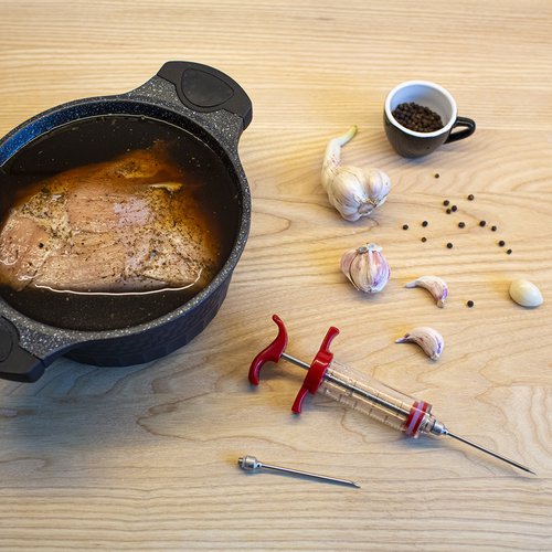 Szynki będą odtąd odpowiednio kruche i na dłużej zachowają świeżość. Jedna igła zakończona jest szerokim wylotem ułatwiającym wstrzykiwanie marynat, druga posiada zaś wylot boczny, świetnie sprawdzi się do nastrzykiwania większych sztuk mięsa. Igły przykręcane na gwint do korpusu zapewniają komfort nastrzyku, gdyż nie ma możliwości, aby igła spadła w czasie przeprowadzania procesu.