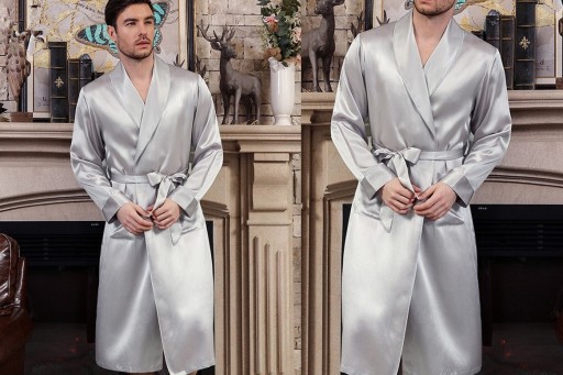 Szlafrok jedwabny uszyty jest w stylu klasycznym z odwijanym kołnierzem oraz rękawami o pełnej długości.