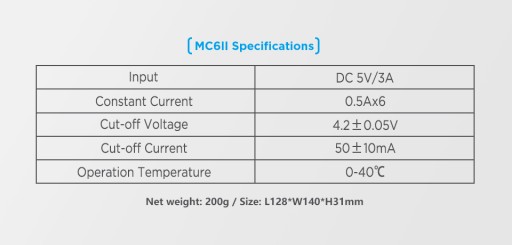 W niewielkiej obudowie ukryta jest w pełni profesjonalna procesorowa ładowarka z trzystopniowym procesem ładowania TC/CC/CV. Ładuje od 1 do 6 ogniw Li-ion 3.6 / 3.7V o dowolnej pojemności w rozmiarach 14500, 14650, 16340, 17500, 17670, 18350, 18500, 18650, 18700. Możliwe jest również ładowanie dwóch akumulatorów o rozmiarze 20700, 21700, 22650, 25500 lub 26650.