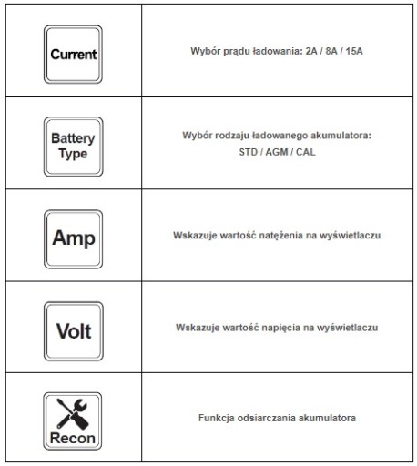 W zależności od wyboru funkcji wyświetlacz LCD wskazuje stan pracy prostownika: