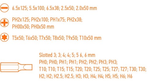- Wkrętak w zestawie: płaskie 6x125 mm, 5x100 mm, 6x38 mm, 2.5x50 mm, 2.0x50 mm krzyżowe PH2x125 mm, PH2x100 mm, PH1x75 mm, PH2x38 mm, PH00x50 mm, PH0x50 mm Torx T5x50 mm, T6x50 mm, T7x50 mm, T8x50 mm, T9x50 mm, T10x50 mm