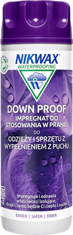 Produkt ten należy stosować do odzieży i sprzętu wypełnionego puchem/pierzem aby ich nieprzemakalność mogła być utrzymana w doskonałym stanie. Należy pamiętać o tym, aby przed zastosowaniem Nikwax Down Proof wyczyścić sprzęt z użyciem Nikwax Down Wash (nie ma potrzeby czekania aż rzeczy wyschną między praniem i impregnacją).