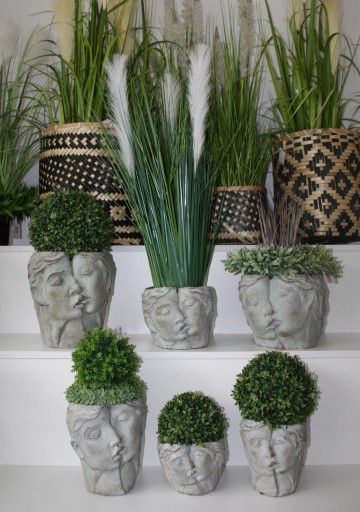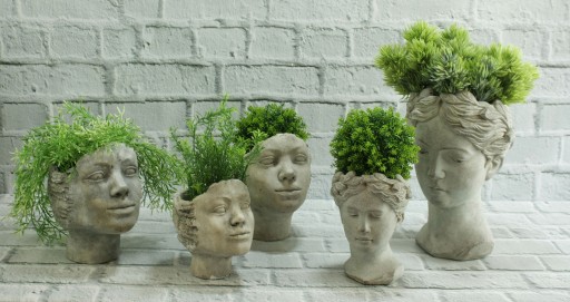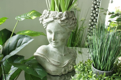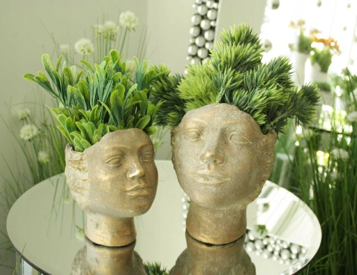 Wykonana z cementu. Wygląda bardzo naturalnie. Niespotykana, doniczka w kształcie głowy wykonana z cementu w kolorze szarym. Donica idealnie łączyć się będzie z naturalnymi barwami w ogrodzie oraz udekoruje Twój dom.