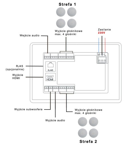 - Panel ścienny dotykowy z kolorowym 7" wyświetlaczem IPS oraz wbudowanym wzmacniaczem 8x25W