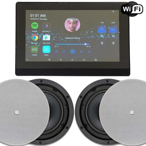Wielofunkcyjne radio internetowe z wifi/bluetooth pod zabudowę podtynkową model MRP4206 w wykończeniu czarnym z kolorowym 7" dotykowym wyświetlaczem IPS oraz czterema okrągłymi białymi 6,5" głośnikami sufitowymi 4x 60W Apart Audio - system firmy HiFi Music. Urządzenie z możliwością obsługi 2 stref audio..