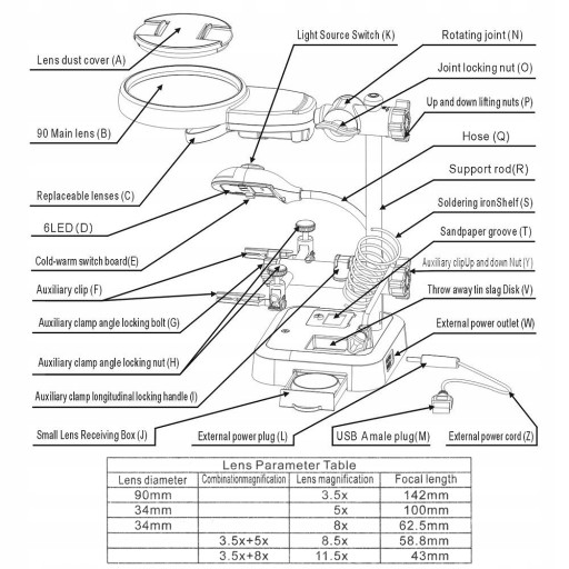 Poniżej znajdziesz opis elementów oraz tabelę z ogniskowymi w zależności od kombinacji zamontowanych lup.