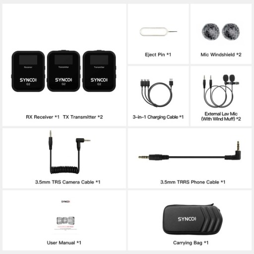 SYNCO G2 A2 to dwukanałowy system mikrofonów bezprzewodowych do nagrywania dwóch źródeł dźwięku w tym samym czasie. System składa się z 2 nadajników z wbudowanym mikrofonem i 1 odbiornika umożliwiających bezprzewodową wymianę sygnałów między urządzeniami oddalonymi aż do 150 metrów w wolnej przestrzeni i którego litowe akumulatory gwarantują aż 8-godzinną pracę przy pełnym naładowaniu. SYNCO G2 A2 jest najlepszym budżetowym systemem bezprzewodowych mikrofonów krawatowych, który sprawdzi się w bardzo szerokiej gamie zastosowań.