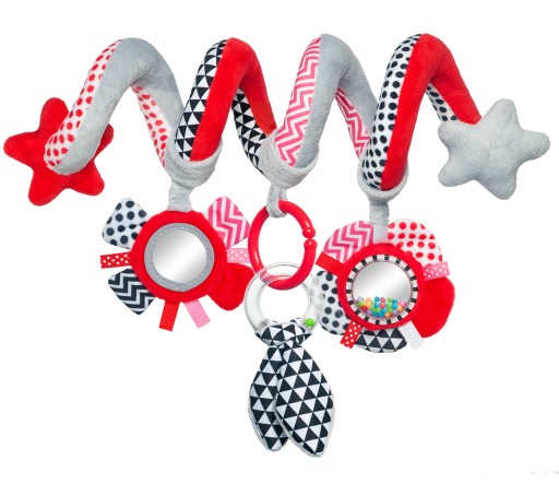 Kolorowa spirala ZIGZAG pasuje do dziecięcego łóżeczka, jak i wózka. Została wykonana z miłego w dotyku materiału o różnorodnej teksturze. Doskonale stymuluje rozwój koordynacji wzrokowo-słuchowej i motorycznej dziecka. Zabawka kryje wiele niespodzianek, które zajmą malca na długi czas. Posiada grzechotkę oraz bezpieczne lusterko.