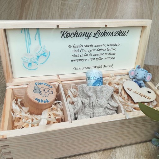 - W środku pamiątkowy tekst drukowany na papierze o wysokiej gramaturze (nie zapomnij podać dla kogo i od kogo!!!) oraz elementy widoczne na zdjęciu wyszczególnione w opisie poniżej