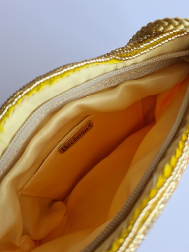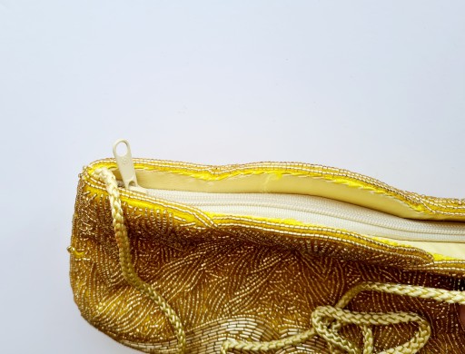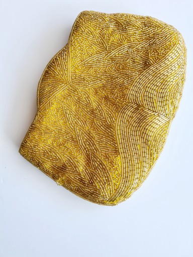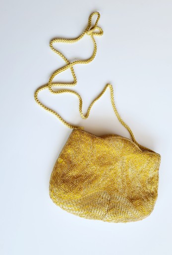 VINTAGE TOREBKA WIECZOROWA ZŁOTA Z KORALIKÓW RĘCZNIE WYSZYWANA, Z LAT 70. PIĘKNIE UŁOŻONE ZŁOTE KORALIKI NA ŻÓŁTYM TLE . ZAPINANA NA ZAMEK . Z PLECIONYM TROCZKIEM NA RAMIĘ .