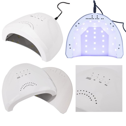 Lampa posiada wbudowany sensor ruchu, timer 30, 60, 90s. Wielkość lampy pozwala na swobodne włożenie całej dłoni, bez potrzeby osobnego utwardzania kciuków. Duży elektroniczny wyświetlacz ułatwi pracę. Urządzenie posiada wbudowany kabel USB, który możemy podpiąć do komputera czy też ładowarki telefonicznej wyposażonej w złącze USB o parametrach 5V od 1 do 2A. Do lampy nie jest dołączony zasilacz.