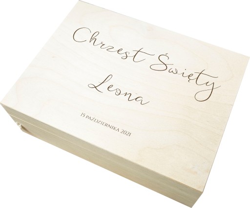W środku znajdziesz wypełnienie w postaci wełny drzewnej. Pudełko będzie piękną pamiątką tej uroczystości.
