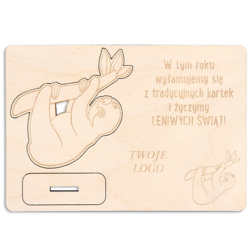 Taka kartka z leniwcem będzie nie tylko oryginalną ozdobą świąteczną ale także świetną zwracającą uwagę, reklamą Państwa firmy.