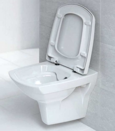 W misce zawieszanej CARINA zastosowana została innowacyjna technologia CleanOn. Brak kołnierza sprawia, że woda obmywa całą wewnętrzną powierzchnię miski, pozostawiając ją zawsze bez zabrudzeń i świeżą. Brak kołnierza to również brak miejsca, gdzie odkładają się bakterie i zarazki. Model przystosowano do oszczędnego spłukiwania 3/5 oraz dostosowano do poziomego odpływu wody. Zestaw zawiera deskę z wysokiej jakości duroplastu, o właściwościach antybakteryjnych. Deska jest idealnie dopasowana do ceramiki, a jej kształt gwarantuje najwyższy komfort użytkowania. Deskę dodatkowo wyposażono w funkcję wolnego opadania i łatwego wypinania.