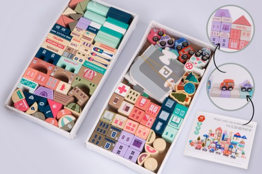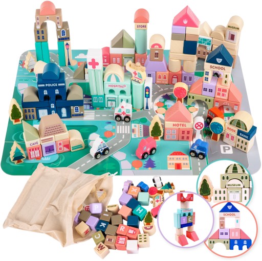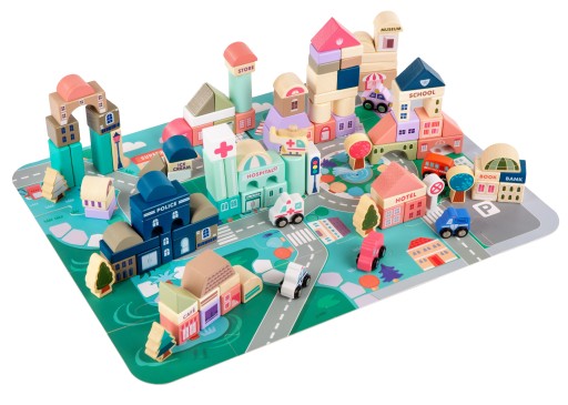 Twoje dziecko może układać, bawić się i w przyjemny sposób zdobywać wiedzę o otaczającym go świecie. Edukacyjne klocki posiadają 115 elementów. Wszystkie elementy malowane są bezpiecznymi dla dzieci oraz przyjaznymi dla środowiska farbami. Brak ostrych krawędzi, przyjemna w dotyku struktura drewna i różne kolorowe kształty. Dziecko może stworzyć z nich dowolne budowle oraz całe miasteczko, co może pozytywnie wpłynąć na rozwój kreatywności i wyobraźni.