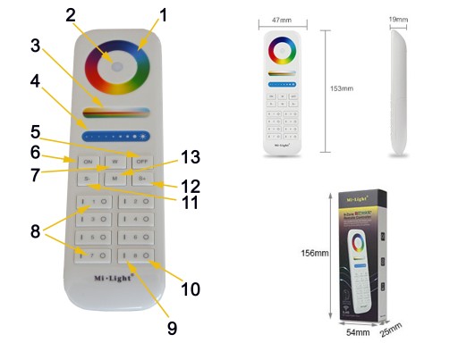 Pilot służy do sterowania każdego typu taśmami LED za pomocą sterowników strefowych Miboxer/MiLight (sterowniki do kupienia na innych naszych aukcjach).