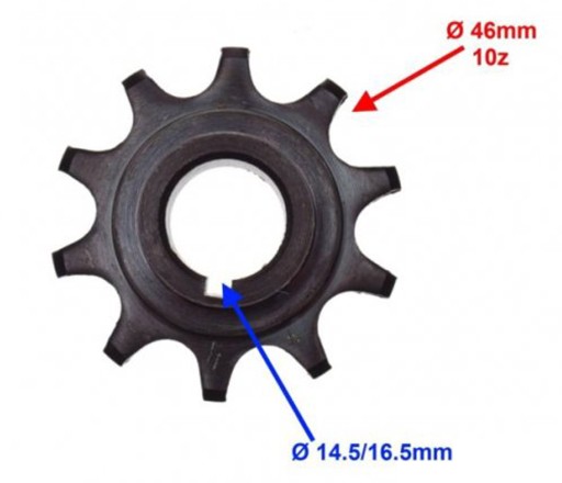 OPIS: Zębatka zdawcza (napędowa) do silnika rowerowego 50cc, liczba zębów: 10. Dodatkowe wymiary na zdjęciu, kompatybilny łańcuch jak od motoroweru Romet 415H