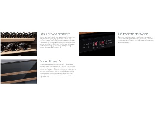 Chłodziarka o pojemności 19 butelek zachwyca designem – elegancką konstrukcją, dębowymi półkami i przyciemnianym szkłem z filtrem UV. Wnętrze skrywa dodatkowo kompresor tłumiący drgania czy element grzewczy. Wszystko po to, by stworzyć warunki przechowywania jak w winnicach. I dzięki temu zachować doskonały smak wina.