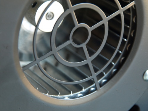 Turbinka metalowa wentylatora nadmuchowego jest zamocowana na wałku silnika elektrycznego.