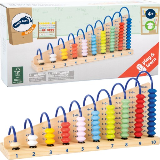 Na dziesięciu metalowych prętach możemy przesuwać kolorowe, drewniane koraliki, podczas gdy na desce drewnianego stojaka znajdziemy działania dodawania i odejmowania, podpowiadające nam kolejne wyniki. Świetne wyzwanie dla każdego małego matematyka! Zabawka pomaga w łatwy sposób opanować pierwsze działania matematyczne w zakresie do 10.