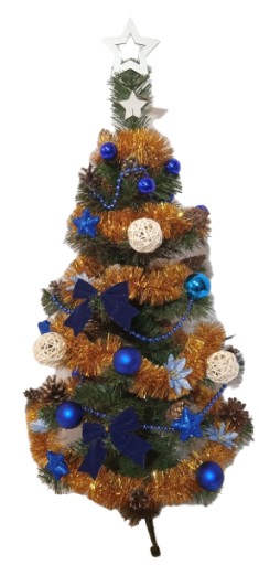 Choinka o kolorze np. złoto-niebieski z organzą to choinka z złotą organzą i złoto-niebieskimi dodatkami.