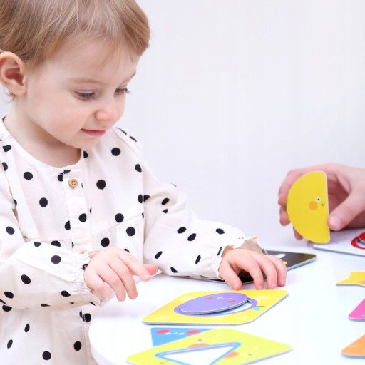 Czas na puzzlową przygodę i poznawanie kształtów! Zacznijcie zabawę od 2 lub 3 układanek, stopniowo dokładając kolejne. Pokaż maluchowi, jak dopasować kształty do tabliczek i opowiadaj, co widać na ilustracji. Każde dopasowanie jest sukcesem i powodem do radości. Nazywajcie kształty i kolory na pełnych humoru ilustracjach.