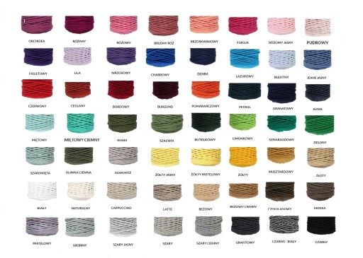 Kolory do wyboru z palety. Po zakupie proszę o wiadomość odnośnie kolorów. Należy pamiętać że zdjęcia mogą delikatnie odbiegać od rzeczywistego koloru sznurka. Spowodowane jest to ustawieniami ekranów na których są wyświetlane.