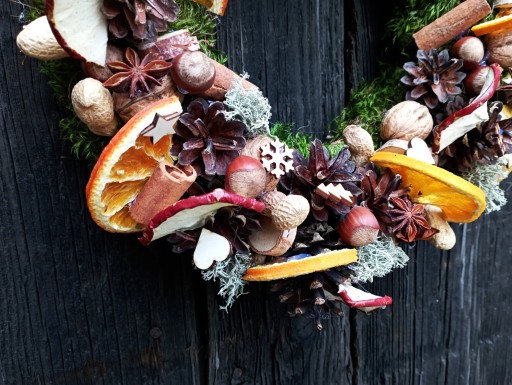 - udekorowany naturalnym, niefarbowanym i nieimpregnowanym mchem, chrobotkiem reniferowym, orzechami, szyszkami, cynamonem, anyżem, suszonymi plastrami pomarańczy i jabłek, drewnianymi ozdobami