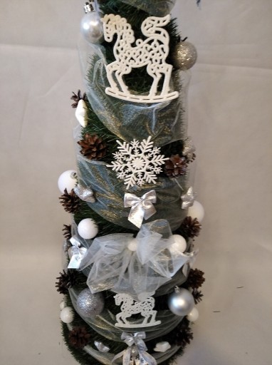 Wykonujemy choinki z dekoracją w kolorze: srebrnym, białym, złotym, niebieskim, czerwonym, brązowym, zielonym, fioletowym lub mieszanym np. złoto-czerwona.