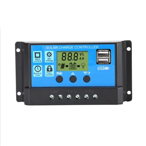Solarny regulator i kontroler ładowania do paneli fotowoltaicznych 12/24V z wyświetlaczem LCD i portami USB.