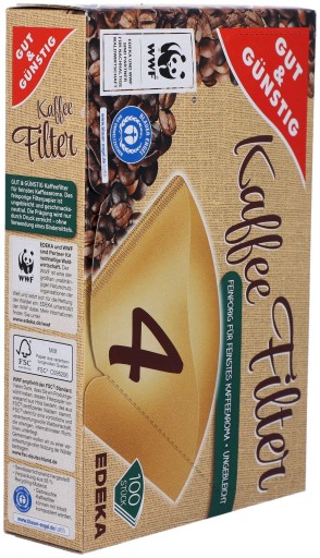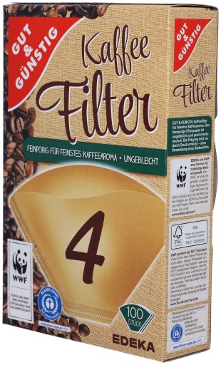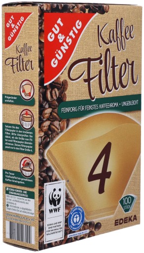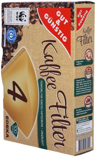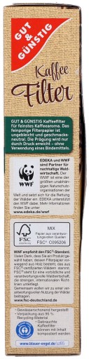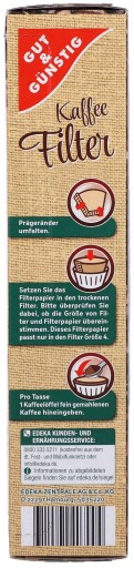 Filtry do kawy EDEKA Gut & Günstig dają gwarancję uzyskania najlepszego aromatu kawy. Zastosowana w filtrach bibuła ma drobne pory i nie jest bielona, dzięki czemu filtr jest ekologiczny a jego użycie nie wpływa na smak kawy. Wytłoczenie w filtrze uzyskuje się jedynie poprzez nadruk nie stosuje się klei ani innych środków wiążących.