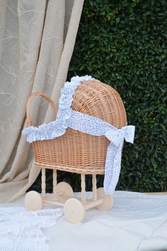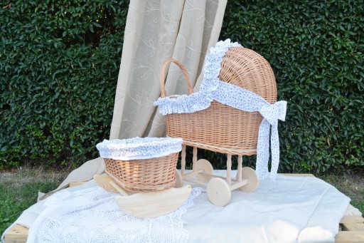 Do każdego wózka oraz kołyski dołączona jest pościel (poduszka oraz kołderka) oraz kokarda wiązana + falbanka (zewnętrzna część wózka)