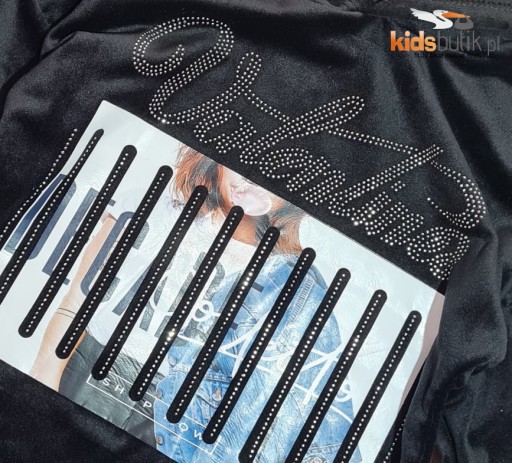 Miękka, welurowa tunika z kapturem ozdobionym odstającymi - cekinowymi uszkami i kolorową - a'la skórkową aplikacją z błyszczącym, dżetowym napisem na przodzie. Rękawy i dół wykończone ściągaczami. Dodatek elastanu sprawia, że świetnie się naddaje i nie krępuje ruchów.