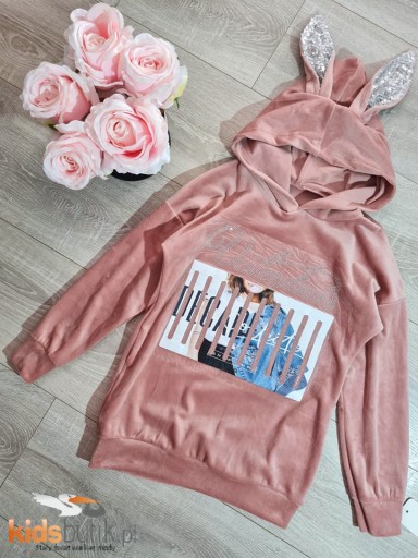 Miękka, welurowa tunika z kapturem ozdobionym odstającymi - cekinowymi uszkami i kolorową - a'la skórkową aplikacją z błyszczącym, dżetowym napisem na przodzie. Rękawy i dół wykończone ściągaczami. Dodatek elastanu sprawia, że świetnie się naddaje i nie krępuje ruchów.