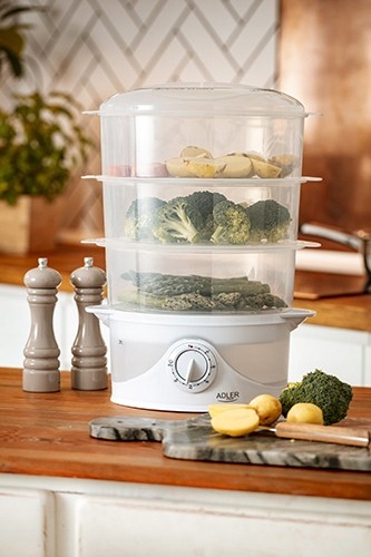 Funkcjonalny parowar o mocy 800 W. Dzięki warstwowo ułożonym pojemnikom, pozwala na jednoczesne przygotowanie kilku potraw. Wytwarzana para obiega wnętrze urządzenia, zapewniając równomierne ogrzewanie wszystkich produktów.