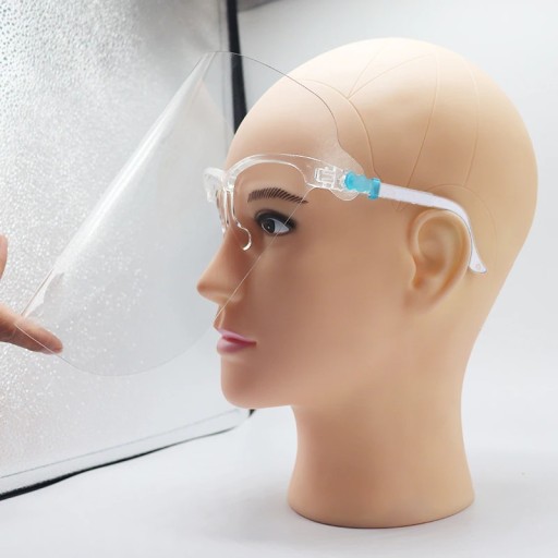 Zintegrowana przesłona z mocowaniem okularowym. Przesłona wykonana z przezroczystej foli PET, zabezpieczona folią ochronną ( dwie strony) do transportu.