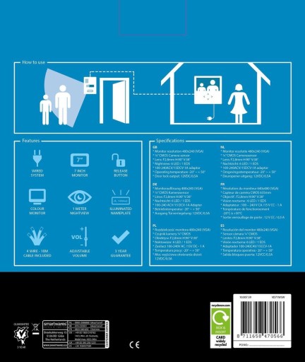 Dzięki wideodomofonowi VD71W firmy Smartwares możesz zobaczyć, kto jest przy drzwiach z domu. Możesz również porozmawiać z odwiedzającym przez domofon VD71W przed otwarciem drzwi. Urządzenie jest wyposażone w kamerę wąsko-liniową. Dzięki diodom LED na podczerwień kamera VD71W firmy Smartwares ma możliwość widzenia w nocy do 1 metra.