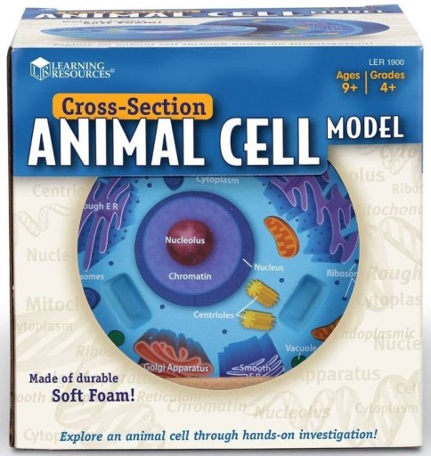 Model komórki zwierzęcej wykonany z miękkiej pianki, rozkładany na dwie części, aby pokazać podstawowe części komórki zwierzęcej, takie jak jądro, jąderko, wakuolę, centriole, błonę komórkową i inne.