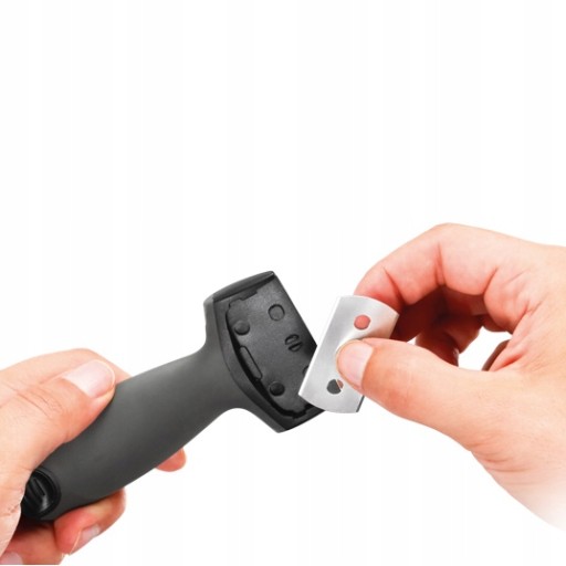 ✅ Skrobak posiada dwa ostrza zamienne umieszczone w rękojeści oraz ochronny pokrowiec do bezpiecznego przechowywania.
