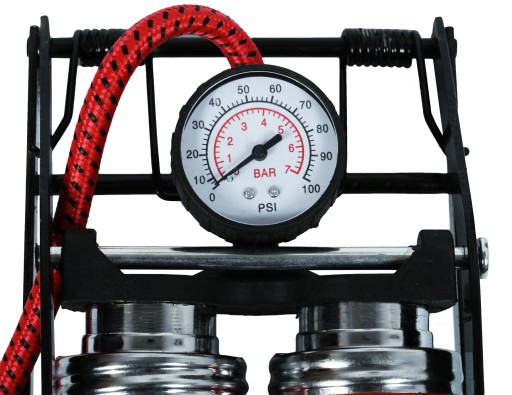 Pompka nożna dwutłokowa o trwałej konstrukcji wykonana jest z tłoczonej blachy stalowej.