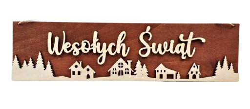 Drewniana tabliczka z napisem Wesołych Świąt.