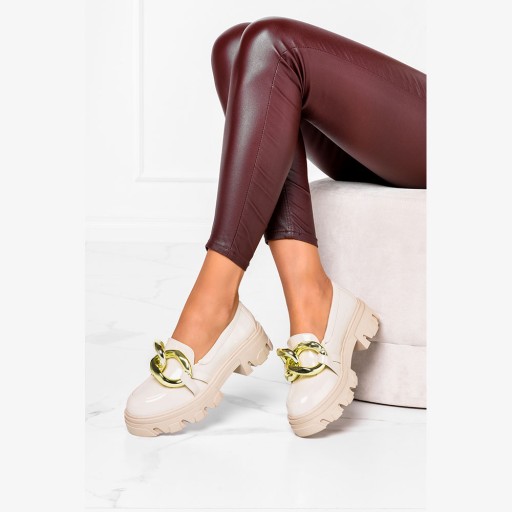 Beżowe mokasyny lakierowane na platformie ze złotym łańcuchem Casu J21X13-BE