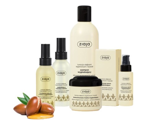 Ziaja zestaw kosmetyków do włosów z olejem arganowym, linia wegańskich kosmetyków do pielęgnacji włosów. Przeznaczone do codziennej pielęgnacji suchych i zniszczonych włosów. Zawierają olej arganowy, który zawiera wit. E i A.