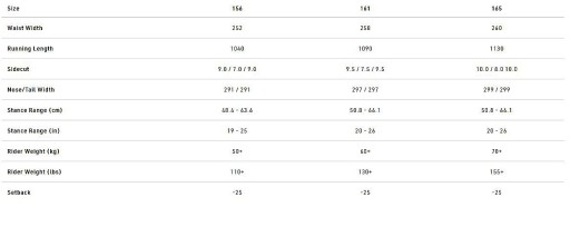 długość 161 cm, szerokość nose/tail 29,7/29,7 cm, waist 25,8 cm, promień 9,5/7,5/9,5 m, stance range 50.8 -66,1, nadaje się dla osób z wagą 60+ kg