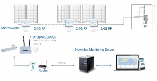 Pełni funkcję bramki komunikacyjnej, która działa pomiędzy mikroinwerterami Hoymiles a serwerem monitorującym WEB Hoymiles. DTU komunikuje się z mikroinwerterem bezprzewodowo, zbierając dane eksploatacyjne systemu, które przekazywane są za pomocą routera na Serwer Monitorujący Hoymiles. Dane eksploatacyjne systemu mikroinwertera zostają przesłane do serwera monitorującego Hoymiles za pośrednictwem DTU.