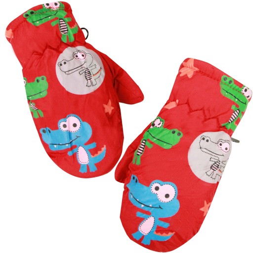 Piękne, ciepłe, jednopalczaste rękawiczki dziecięce z motywem kolorowych krokodyli. Od wewnątrz wypełnione poliestrową ociepliną. Posiadają ściągacz zabezpieczający. Rękawiczki można spiąć razem.