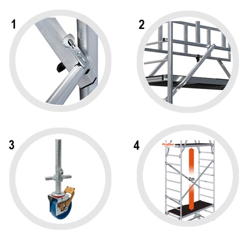 - Od wysokości roboczej 7,30 m rusztowania ProTec wyposażone są w łatwo montowane podpory, zapewniające dodatkową stabilizację i bezpieczne użytkowanie