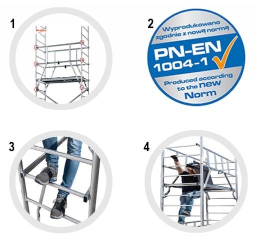 - Atestowane przez TÜV, nośność 200 kg/m², obciążenie do 240 kg (obciążenie powierzchni) zgodne z nową normą PN EN 1004-01, grupa rusztowań 3
